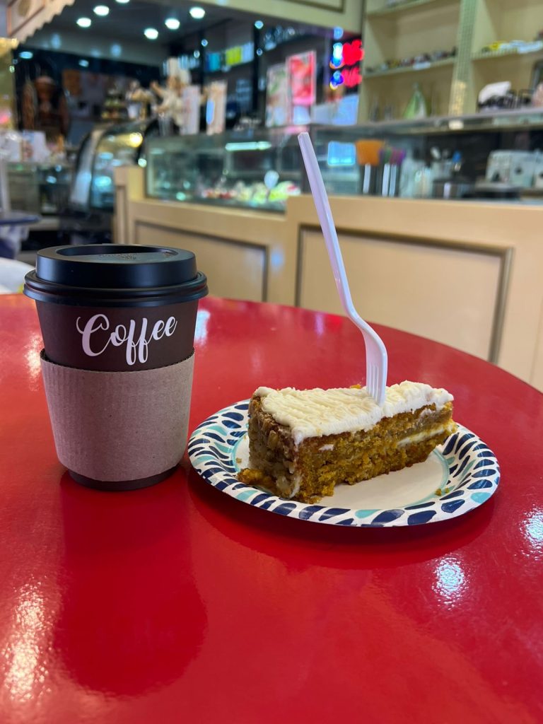 Acompañamos el café con el pastel del día: un pastel de zanahoria. Si bien su sabor es intenso con notas profundas de canela y la dulzura natural de la zanahoria, su ejecución dejó espacio para mejora. El betún, excesivamente grasoso, y la miga del bizcocho, ligeramente compacta, restaron finura a un postre que, con algunos ajustes, podría alcanzar su máximo esplendor.