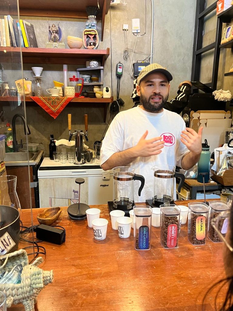 La travesía comenzó en el local 19, BREW SLOW, con una cata dirigida por el chef Emanuel, quien ofreció mucho más que una degustación: una verdadera clase magistral. A través de su guía conocimos el origen, los procesos de fermentación y las técnicas de extracción del café. Probamos cuatro métodos: lavado, semilavado, honey y natural, cada uno con perfiles sensoriales únicos, desde notas florales y frutales hasta matices terrosos y dulces, que revaloraron nuestra percepción de esta bebida milenaria.