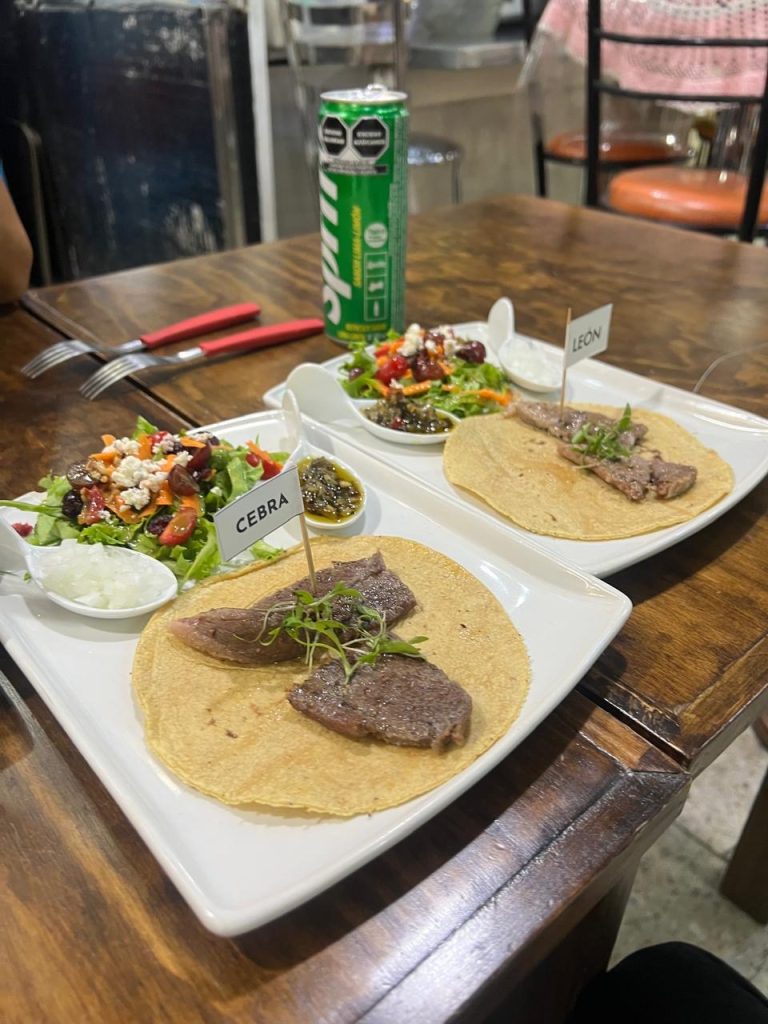 La tercera parada fue en El Gran Cazador México, donde probamos tacos de león y de cebra por $139 pesos cada uno. Provenientes de criaderos certificados en territorio nacional, estas carnes despiertan tanto curiosidad como respeto. La carne de león resultó densa, fibrosa y con un sabor que recuerda a una res más intensa. En contraste, la cebra ofreció una textura más suave, menos fibrosa, y un perfil gustativo entre el vacuno y el venado. Ambos tacos, perfectamente sazonados, ofrecieron una experiencia singular.
