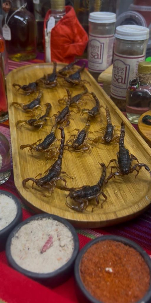 Finalmente, cerramos con un guiño al México ancestral: una tabla de insectos por $300 pesos. Incluía alacrán, gusanos de maguey y otros insectos seleccionados, que aunque desafían visualmente al comensal, ofrecen una textura crujiente y sabores tostados, con un retrogusto salino que remite a la cocina prehispánica. Más allá del espectáculo, la experiencia resulta nutritiva, cultural y profundamente reveladora.